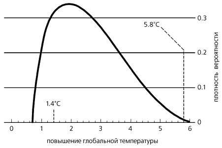 Распределение вероятностей повышения глобальной температуры к 2090-2100 гг. по сравнению с 1990 г. Площадь под кривой равна единице. Пунктирными линиями отмечены наименьшее и наибольшее вероятные значения повышения температуры 1.4° и 5.8°С, согласно данным Межгосударственного совета по изменению климата. (Источник: Uncertainty Analysis of Global Climate Protection. The Economist, April 7-13th. 2001.)Естественно, западные государства вряд ли могли согласиться с такой постановкой вопроса. Документ, подписанный в Рио, содержал призыв к индустриально развитым странам (но не обязывал их) сократить масштабы выбросов N2O и СО2 к 2000 г. до уровня, ниже достигнутого в 1990-м, или по крайней мере до соответствующего ему. Была продекларирована приверженность принципу квот, но основную часть итогового документа составляли лишь общие заверения участников об их стремлении бороться за более безопасную среду обитания человека. Киотский протокол был призван конкретизировать эти абстрактные формулировки, и в определенной мере он достиг этой цели. Представители 55 государств, подписавшие его, согласились с тем, что выбросы в промышленно развитых странах шести основных вредных соединений - CO2, CH4, N2O, HFCs, PFCs и SF6 - с 2008 по 2012 г. должны быть сокращены на 6-8% по отношению к уровню 1990 г. При этом в протоколе не было оговорено никаких ограничений для развивающихся стран, и, кроме того, для отдельных промышленно развитых государств устанавливались, мягко говоря, существенно разные ориентиры (Австралии разрешалось даже повысить эмиссию на 8%). Между тем подсчеты показывают, что даже в случае соблюдения подобных ограничений суммарные выбросы CO2 в 2012 г. могут превосходить уровень 1990 г. на 30% только за счет его эмиссии в развивающихся странах.Киотский протокол не только был изначально недейственным, но и не имел реальных шансов стать подлинно международным договором. Еще до подписания протокола сенат США заявил, что не ратифицирует соглашение до тех пор, пока в нем не будут оговорены обязанности развивающихся стран. Ущерб, наносимый Соединенным Штатам этим актом, был настолько очевиден, что подписавший его вице-президент А.Гор даже не пытался вспоминать об этом своем “достижении” в ходе предвыборной кампании 2000 г. Мало кто сомневался, что повторится ситуация, возникшая в связи с Монреальским протоколом, гораздо более жестко обязывавшим сократить производство озоноразрушающих веществ: через пять лет после его подписания США полностью прекратили их выпуск, страны ЕС сократили их в 11 раз, в то время как Индонезия повысила производство на две трети, Китай - вдвое, а Индия - в три раза! Затраты же на сокращение в США эмиссии CO2 на 20% ниже уровня 1990 г. могут составить, по оценкам Комитета экономических советников при президенте, до 3.6 трлн долл., т.е. более 40% американского валового национального продукта.