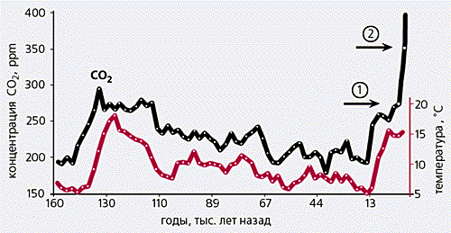 Реконструкция колебаний содержания CO2 и средней глобальной температуры земной поверхности (160 тыс. лет назад - 2100 г.). Стрелками отмечены точки на графике, в которых содержание CO2 составляло 280 ppm (1), что соответствовало началу индустриальной революции, и 353 ppm (2), отвечающее современному периоду, когда концентрация CO2 вследствие производственной деятельности человечества превысила предыдущий максимум. (Источник: Global Common Institute, London. Weizsдcker E.U. von. Earth Politics. Foreword by the President of the Club of Rome. L.; New Jersey, 1994. P.43.)Таким образом, борьба за предотвращение глобального потепления стала к концу ХХ в. всеобщей заботой, и все государства планеты оказались, с одной стороны, причастны к этой проблеме, с другой - заинтересованы в ее разрешении. В результате всеобщие договоренности в данной области не могли не оказаться на повестке дня.Что же произошло в Киото?