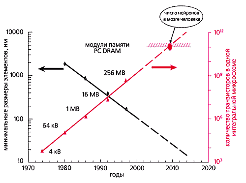 – уже упоминавшиеся различные устройства на углеродных нанотрубках;Несмотря на нарастающий уровень трудностей, в течение трех последних десятилетий поддерживается неизменный и очень высокий темп роста всех существенных характеристик в микроэлектронике. Наиболее революционные достижения приближаются к квантовым пределам, положенным самой Природой - когда работает один электрон, один спин, квант магнитного потока, энергии и т.д. Это сулит быстродействие порядка ТГц (~1012 операций в секунду), плотность записи информации ~103 Тбит/см2, что на много порядков выше, чем достигнутые сегодня, а энергопотребление - на несколько порядков ниже. При такой плотности записи в жестком диске размерами с наручные часы можно было бы разместить громадную библиотеку национального масштаба или фотографии, отпечатки пальцев, медицинские карты и биографии абсолютно всех (!) жителей Земли. Действительно, с принципиальной точки зрения для оперирования в двоичной системе исчисления необходимы элементы, которые способны реализовывать два устойчивых (стабильных во времени и не разрушаемых термическими флуктуациями) состояния, соответствующие “0” и “1”, и допускать быстрое переключение между ними. Такие функции может выполнять электрон в двухуровневой системе (например, в двухатомной молекуле - перейти с одного атома на другой). Это реализовало бы заветную мечту - одноэлектронное устройство. К сожалению, пока лучшие современные электронные средства неэкономно “тратят” сотни, тысячи электронов на одну операцию. Другая возможность - переориентировать спин электрона из одного устойчивого состояния в другое (например, воздействуя магнитным полем), чем и занимается спинтроника.– одноэлектроника, спинтроника и джозефсоновская электроника, в том числе квантовые компьютеры;