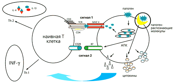 Антиген-презентирующие клетки (АПК), к которым относятся дендритные клетки, макрофаги и некоторые другие, взаимодействуют с патогеном. Поглощенный патоген индуцирует синтез антигенных пептидов, которые представляются в комплексе с антигенами главного комплекса гистосовместимости (major histocomplatibility complex - MHC), формируя первый сигнальный каскад. Одновременно с этим АПК распознает “чужого”, запускает цитокиновый каскад и синтезирует костимуляторную (кооперативно действующую) молекулу В7, обеспечивая второй сигнальный каскад. Таким образом наивная Т-клетка превращается в обученную клетку-помощника. Через сложный каскад цитокинов и взаимодействий такая клетка инициирует антительный и/или цитотоксический Т-лимфоцитарный ответ (рис.2). Для надежности природой придуманы два сигнала, помогающие избежать ответа на “свои” антигены, который может привести к аутоиммунным заболеваниям. В случае злокачественной трансформации клеток организма именно отсутствие второго сигнала блокирует противоопухолевый ответ иммунной системы. Распознавание “чужого” происходит с помощью врожденной системы защиты организма.