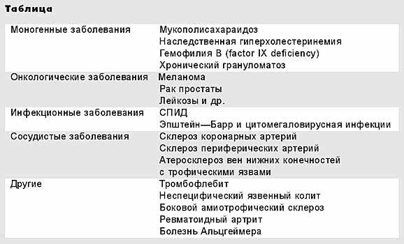 Принципиальное отличие генной терапии от любой другой в том, что она направлена на устранение не симптомов заболевания, а его первопричины. В недалеком будущем благодаря созданию генетической карты каждого отдельного человека можно будет предсказать, а, значит, и предотвратить вероятную предрасположенность к заболеваниям. Некоторые из них уже сегодня могут служить объектом генной терапии (табл.1).