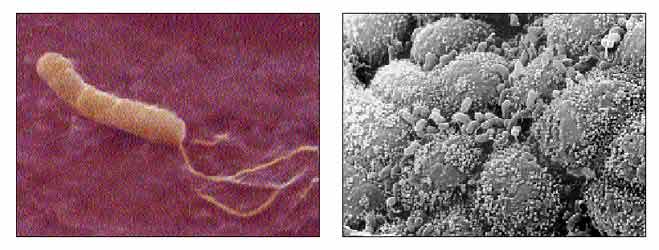 Микрофотографии H.pylori: изолированный (чистая культура; увел. 9500; электронограмма М.Блока; © 1997 Sparre Medical AB ) и популяция (биоптат из антрального отдела желудка; увел. 3900; электронограмма Г.Стира; © 2002 Blackwell Scientific Publications).Задача, поставленная Уорреном и Маршаллом, была успешно решена. Их совместная работа завершилась. В 1986 г. Маршалл уехал в США, и дальнейшее изучение бактерии, открытой врачами из Королевского госпиталя Перт, фактически не связанно с их именами. Этой проблемой занялись несколько исследовательских групп: А.Ли в Сиднее и К.Макнулти в Вустере (Великобритания) впервые после первооткрывателей получили чистую культуру “бактерии Уоррена-Маршалла”, а С.Гудвин с сотрудниками из того же Королевского госпиталя Перта подробно описали ее и, выделив в самостоятельный род, назвали Helicobacter pylori. С тех пор пилорический хеликобактер, инфицирующий, по данным эпидемиологов, не менее половины населения планеты, привлекает внимание специалистов различного профиля - от микробиологов и молекулярных биологов до санитарных врачей и организаторов здравоохранения.В 1987 г. была создана Европейская группа по изучению пилорического хеликобактера (The European Helicobacter pylori Study Group) - неправительственная структура, призванная координировать усилия различных групп исследователей. (Впоследствии подобные группы возникли в различных странах; восемь лет спустя такая группа создана и в России по инициативе профессора Л.И.Аруина - одного из пионеров изучения H.pylori в нашей стране.)