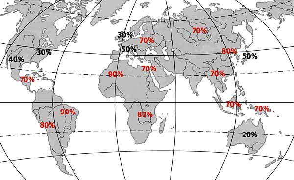 Распространенность пилорического хеликобактера в мире (www.helico.com).