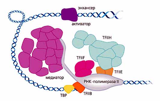 Транскрипция - это процесс матричного синтеза РНК на ДНК, который осуществляется ферментами РНК-полимеразами. У эукариот в него вовлечены несколько сложных олигомерных белковых комплексов: РНК-полимераза, общие факторы транскрипции и белковый комплекс медиатора. Перечисленные комплексы вместе со специфическими факторами транскрипции (активаторами) инициируют синтез РНК, начиная с промотора соответствующего гена в ДНК.