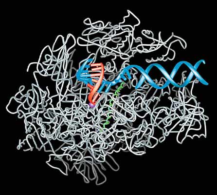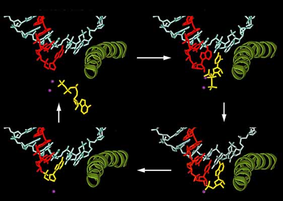Кристаллографическое исследование комплексов полимеразы с нуклеотидами позволило описать поэтапно ход присоединения нуклеотида к растущей цепи (рис.3). На первом этапе NTP (нуклеозидтрифосфат) приближается к растущей цепи и связывается в Е-сайте ниже активного центра в обращенной ориентации. Далее происходит вращение нуклеотида, в результате чего он перемещается в А-сайт. В случае комплементарности входящего нуклеотида матричному основанию ДНК на третьем этапе образуется фосфодиэфирная связь. Все завершается транслокацией, необходимой для повторения цикла. Отбор комплементарного нуклеотида контролируется свойствами РНК-ДНК гибрида. Если нуклеотид некомплементарен, он не удерживается в активном центре, и селекция продолжается. Таким образом, в серии кристаллографических исследований комплексов РНК-полимеразы с компонентами системы была установлена на атомном уровне динамическая картина инициации транскрипции.