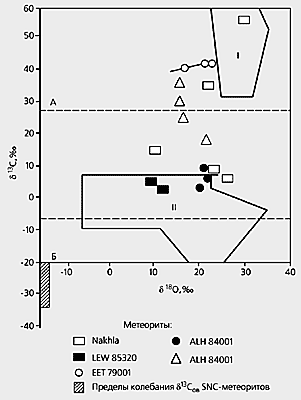 Êîìïëåêñíîå èçó÷åíèå ìèíåðàëîãèè è ãåîõèìèè SNC-ìåòåîðèòîâ äàëî íîâûå ðåçóëüòàòû, î÷åíü âàæíûå äëÿ áèîãåîõèìèêîâ, èíòåðåñóþùèõñÿ ïðîáëåìîé ïðîèñõîæäåíèÿ è ýâîëþöèè æèâûõ ñèñòåì íà Ìàðñå. Ãåîõèìèêè èç Îòêðûòîãî óíèâåðñèòåòà (Âåëèêîáðèòàíèÿ), îáíàðóæèâ â îäíèõ è òåõ æå ïðîáàõ îðãàíè÷åñêîå âåùåñòâî è êàðáîíàòíûå ìèíåðàëû [9], îáðàòèëè âíèìàíèå íà ñóùåñòâåííûå ðàçëè÷èÿ â èçîòîïíîì ñîñòàâå óãëåðîäà êàðáîíàòîâ è îðãàíè÷åñêîãî âåùåñòâà. Êàðáîíàòíûå ìèíåðàëû SNC-ìåòåîðèòîâ ñèëüíî îáîãàùåíû èçîòîïîì 13Ñ ïî ñðàâíåíèþ ñ ÑÎ2 ìàðñèàíñêîé àòìîñôåðû. Ñðåäíÿÿ âåëè÷èíà d13Ñ ñîñòàâëÿåò +41.5‰.  òî æå âðåìÿ îðãàíè÷åñêèé óãëåðîä çàìåòíî îáîãàùåí èçîòîïîì 12Ñ (d13Ñ êîëåáëåòñÿ îò –20.0 äî –33.0‰). Ñòîëü çàìåòíàÿ âåëè÷èíà ôðàêöèîíèðîâàíèÿ ñòàáèëüíûõ èçîòîïîâ óãëåðîäà ìîæåò íàáëþäàòüñÿ òîëüêî â íèçêîòåìïåðàòóðíûõ óñëîâèÿõ è òîëüêî ïðè ó÷àñòèè æèâûõ îðãàíèçìîâ [10].