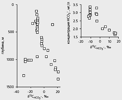 Èçîòîïíûé ñîñòàâ óãëåðîäà áèêàðáîíàòà ïîäçåìíûõ âîä áàçàëüòîâûõ âîäîíîñíûõ ãîðèçîíòîâ áàññåéíà Êîëóìáèà Ðèâåð (ÑØÀ). Ïî ìåðå óãëóáëåíèÿ â òîëùó áàçàëüòîâûõ ïîðîä óãëåðîä áèêàðáîíàòà îáîãàùàåòñÿ èçîòîïîì 13Ñ (ñëåâà). Îáîãàùåíèå ïîäçåìíûõ âîä èçîòîïîì 13Ñ ïî ìåðå óìåíüøåíèÿ â íèõ ñîäåðæàíèÿ áèêàðáîíàòà (ñïðàâà).Ïîõîæàÿ ñèòóàöèÿ îïèñàíà Ò.Ñòèâåíñîì è Äæ.Ìàê-Êèíëè [6], êîòîðûå èçó÷àëè âîäîíîñíûå ãîðèçîíòû áàçàëüòîâûõ ïîðîä â ìàññèâå Êîëóìáèà Ðèâåð. Ñîäåðæàíèå ìåòàíà â îáñëåäîâàííûõ âîäàõ äîõîäèëî äî 160 ìêÌ, à âîäîðîäà - äî 110 ìêM. Êàê âèäíî èç äàííûõ, ïðèâåäåííûõ â òàáë.2, ÷èñëåííîñòü àâòîòðîôíûõ àíàýðîáîâ, èñïîëüçóþùèõ âîäîðîä â êà÷åñòâå äîíîðà ýëåêòðîíîâ (ò.å. ñóëüôàòðåäóêòîðîâ, ìåòàíîãåíîâ è àöåòîãåíîâ), ïðåâûøàåò ÷èñëåííîñòü ãåòåðîòðîôíûõ ïðåäñòàâèòåëåé ýòèõ æå ãðóïï áàêòåðèé. Èçîòîïíûé ñîñòàâ óãëåðîäà áèêàðáîíàòà ïîäçåìíûõ âîä äîâîëüíî óáåäèòåëüíî äîêàçûâàåò, ÷òî ïî ìåðå ïîòðåáëåíèÿ óãëåðîäà áèêàðáîíàòà â ïðîöåññå àâòîòðîôíîãî ìåòàíîãåíåçà ïðîèñõîäèò ñóùåñòâåííîå îáîãàùåíèå îñòàòî÷íîãî áèêàðáîíàòà òÿæåëûì èçîòîïîì 13Ñ, âïëîòü äî âåëè÷èí d13Ñ = 20‰.