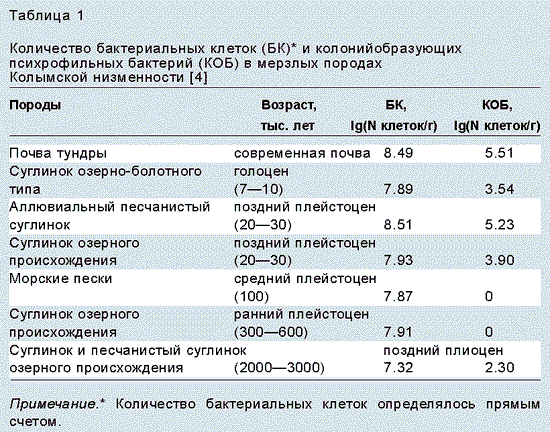 Êîëè÷åñòâî êëåòîê ìèêðîîðãàíèçìîâ â êåðíàõ ëåäÿíîãî ùèòà Àíòàðêòèäû áûëî íåâåëèêî, ïîñêîëüêó ýòà ìèêðîôëîðà ïîïàäàëà â Àíòàðêòèäó ïóòåì ýîëîâîãî ïåðåíîñà âìåñòå ñ ÷àñòè÷êàìè ïûëè. Çíà÷èòåëüíî áîëüøèå êîëè÷åñòâà æèçíåñïîñîáíûõ êëåòîê îáíàðóæåíû ñîòðóäíèêàìè ëàáîðàòîðèè Ä.Ãåëè÷èíñêîãî, êîòîðûå â òå÷åíèå äëèòåëüíîãî âðåìåíè èçó÷àëè ðàñïðîñòðàíåíèå ìèêðîîðãàíèçìîâ â êåðíàõ ìåðçëûõ ãðóíòîâ è îñàäî÷íûõ ïîðîä Âîñòî÷íîé Ñèáèðè (òàáë.1) è Àíòàðêòèäû [4].