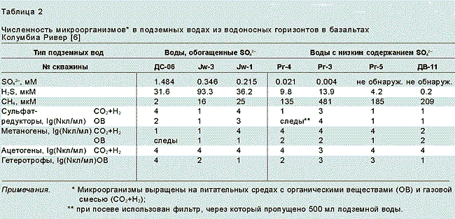 Íåñìîòðÿ íà òî ÷òî ñîäåðæàíèå îðãàíè÷åñêîãî âåùåñòâà è â ïîðîäàõ, è â âîäå êðàéíå íèçêîå, Ï.Ïåäåðñîí è åãî ñîòðóäíèêè óñòàíîâèëè â âîäîíîñíûõ ãîðèçîíòàõ áàçàëüòîâ Âîñòî÷íîé Øâåöèè ìíîãî÷èñëåííóþ è ðàçíîîáðàçíóþ ìèêðîôëîðó.  íàèáîëåå ãëóáîêèõ ãîðèçîíòàõ çàìåòíî ïðåîáëàäàëè àíàýðîáíûå ìèêðîîðãàíèçìû: ñóëüôàòðåäóêòîðû, ìåòàíîãåíû è àöåòîãåíû. ×èñëåííîñòü ìåòàíîãåíîâ, íàïðèìåð, äîñòèãàëà 60-80% îò îáùåé ÷èñëåííîñòè ìèêðîáîâ, ó÷èòûâàåìûõ ïðÿìûì ñ÷åòîì. Îáíàðóæåíèå èçîòîïíî ëåãêèõ ñóëüôèäîâ è ðàñòâîðåííîãî â âîäå ìåòàíà (äî 4 ìë/ë) ïîçâîëÿåò ãîâîðèòü î òîì, ÷òî ïî êðàéíåé ìåðå ñóëüôàòðåäóêòîðû è ìåòàíîãåíû àêòèâíî ôóíêöèîíèðóþò â ïîäçåìíîé ýêîñèñòåìå áàçàëüòîâûõ ïîðîä. Îñíîâíûì äîíîðîì ýëåêòðîíîâ äëÿ àâòîòðîôíûõ àíàýðîáíûõ áàêòåðèé öèêëà ñåðû è óãëåðîäà ñëóæèò âîäîðîä, ñîäåðæàíèå êîòîðîãî ñîñòàâëÿåò â ïðîáàõ ïîäçåìíîé âîäû 3.8 - 4.6 ìë/ë.
