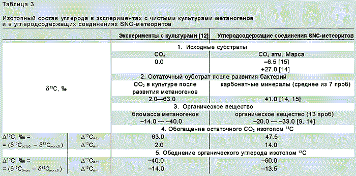 Èçîòîïíûé ñîñòàâ óãëåðîäà (d13Ñ) è êèñëîðîäà (d18Î) â êàðáîíàòàõ èç ðàçíûõ ìåòåîðèòîâ. Ðèìñêèìè öèôðàìè îáîçíà÷åíû êàðáîíàòû: I - óãëèñòûõ õîíäðèòîâ; II - îáðàçóþùèåñÿ ïðè íàçåìíîì âûâåòðèâàíèè îáû÷íûõ õîíäðèòîâ. Çíà÷åíèÿ ðàçíûõ àâòîðîâ äëÿ ìåòåîðèòà ALH 84001 âçÿòû èç ðàáîòû [14]. À è Á - èçîòîïíûé ñîñòàâ CO2 ìàðñèàíñêîé àòìîñôåðû: À - äàííûå ×.Ãàìåòöà èç [14], Á - Õ.Òåéëîðà èç [15].Ïî äàííûì Äæ.Ãóäèíãà [11], êàðáîíàòû SNC-ìåòåîðèòîâ âõîäÿò â ñîñòàâ êîìïëåêñà âòîðè÷íûõ ìèíåðàëîâ, çàïîëíÿþùèõ òðåùèíû è æåîäû â îñíîâíûõ è óëüòðàîñíîâíûõ ïîðîäàõ. Âòîðè÷íàÿ àññîöèàöèÿ ìèíåðàëîâ â òðåùèíàõ ìåòåîðèòîâ îáðàçîâàëàñü èç íèçêîòåìïåðàòóðíûõ (íèæå 100°Ñ) ãèäðîòåðìàëüíûõ ðàñòâîðîâ ñ pH îêîëî 8 è Eh ìåíüøå –220 ìÂ. Òàêèå óñëîâèÿ âïîëíå áëàãîïðèÿòíû äëÿ ðàçâèòèÿ òåðìîôèëüíûõ àíàýðîáíûõ ìèêðîîðãàíèçìîâ, è ìîæíî ïîëàãàòü, ÷òî îáíàðóæåííûå ýôôåêòû ôðàêöèîíèðîâàíèÿ ñòàáèëüíûõ èçîòîïîâ óãëåðîäà - ñëåäñòâèå ðàçâèòèÿ õåìîëèòîàâòîòðîôíûõ ìåòàíîãåíîâ.  òàáë.3 ñðàâíèâàþòñÿ âåëè÷èíû d13Ñ óãëåêèñëîòû (èñõîäíîãî ñóáñòðàòà äëÿ ìåòàíîãåíåçà) è îðãàíè÷åñêîãî âåùåñòâà áèîìàññû ìåòàíîãåíîâ.  ëåâîé êîëîíêå ïðèâåäåíû äàííûå íàøèõ ýêñïåðèìåíòîâ ñ ÷èñòûìè êóëüòóðàìè ìåòàíîãåíîâ [12], â ïðàâîé - ðåçóëüòàòû èçó÷åíèÿ èçîòîïíîãî ñîñòàâà óãëåðîäíûõ ñîåäèíåíèé ìàðñèàíñêèõ ïîðîä è àòìîñôåðû Ìàðñà. Õîðîøî âèäíî, ÷òî êàê îáîãàùåíèå îñòàòî÷íîé óãëåêèñëîòû èçîòîïîì 13Ñ, òàê è îáåäíåíèå ýòèì èçîòîïîì îðãàíè÷åñêîãî âåùåñòâà â îáåèõ êîëîíêàõ èìåþò ñõîäíûå âåëè÷èíû. Îñòàåòñÿ òîëüêî äîáàâèòü, ÷òî â áàçàëüòàõ Êîëóìáèà Ðèâåð, ãäå ñîâðåìåííûå ïðîöåññû ìåòàíîãåíåçà äîêàçàíû ýêñïåðèìåíòàëüíî, íàèáîëåå èçîòîïíî-òÿæåëûé îñòàòî÷íûé ìèíåðàëüíûé óãëåðîä ïîäçåìíûõ âîä îáîãàùåí èçîòîïîì 13Ñ íà 37‰ ïî ñðàâíåíèþ ñ àòìîñôåðíîé óãëåêèñëîòîé.