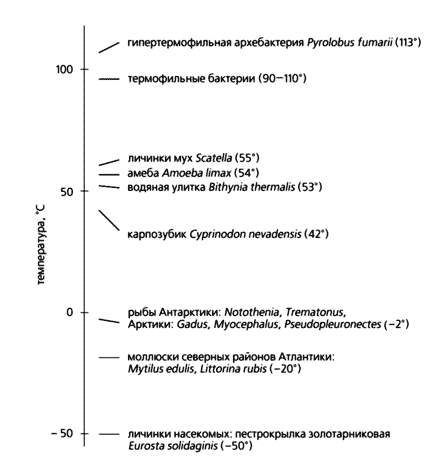 Температурные границы существования некоторых организмовИз всего многообразия адаптаций к отдельным экологических факторам (температуре, содержанию кислорода в среде, солености воды, освещенности, влажности) или к иным типам природной среды (высокогорью, морским глубинам, жизни в пещерах, в пустынях и др.) особенно интересны температурные. Ведь этот фактор воздействует на все живые существа; окружающая температура постоянно меняется, ее перепады в определенных районах бывают весьма значительными, и организмы, в особенности холоднокровные, должны к этому приспосабливаться. Жизнь при экстремальных температурах привела к формированию адаптационных механизмов, которые значительно расширили ее “температурные пределы” и позволили отдельным видам занять экологические ниши, практически непригодные для существования. Эти механизмы не позволяют кристаллам льда образовываться в теле личинок насекомых и разрушать их при –50°С. Напротив, термофильные бактерии - обитатели гидротермальных источников - живут при +110°С и их белки при этом не денатурируют. Вместе с тем температура среды - один из важных факторов, влияющих на распределение, численность и разнообразие видов в различных климатических зонах Земли.