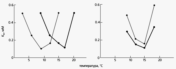 Другой механизм связан с изменением функциональных свойств ферментов без изменения их изоформ. Так, в нашей лаборатории в Институте биологии развития им. Н.К.Кольцова РАН было обнаружено, что у рыб [7, 8] при адаптациях к низким и высоким температурам в течение нескольких недель меняются функциональные свойства ферментов. На примере лактатдегидрогеназы из скелетных мышц вьюна показано, что величина константы Михаэлиса (КМ), по которой можно судить о сродстве фермента с субстратом, зависит от ряда факторов, в том числе и от температуры: при оптимальной - КМ минимальна (т.е. фермент-субстратное сродство максимально), значит, фермент функционирует наиболее эффективно. У рыб, адаптированных к холодной воде, фермент-субстратное сродство максимально при низкой температуре. У рыб, помещенных в теплую воду, в течение двух-трех недель оптимум фермента постепенно смещается в сторону высокой температуры. Это говорит о том, что за данный срок фермент перестраивается на работу в новых условиях.