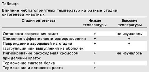 Какие стадии онтогенеза наиболее уязвимы при действии неблагоприятных температур? Самый чувствительный - период размножения, в котором отрицательный эффект проявляется на клеточном и тканевом уровнях. Так, пониженные температуры останавливают созревание гамет и снижают эффективность оплодотворения (табл.). Взрослые же особи способны выживать в наиболее широком диапазоне. Это обеспечивается наличием сформированных эффективных регуляторных механизмов (нервных и эндокринных), которые контролируют защиту от неблагоприятных температур. Эмбриогенез занимает промежуточное положение. Здесь из-за активного роста клеток быстро реализуются все возможные нарушения. В частности, низкие температуры ингибируют расхождение хромосом при делении клеток. Наиболее чувствительны гаструляция и вылупление зародышей из оболочек.