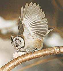 Среди наших синиц есть одна особенная, небольшая птичка — хохлатая синица (P.cristatus). Она и внешне от своих сородичей отличается. Прежде всего, окраской и хохолком. Помню, отдал как-то в печать негативы с хохлатыми синицами, а приемщица, вручая фотографии, спрашивает: “А где вы таких попугайчиков снимали?” А ведь и действительно, с распущенными крыльями хохлатая синица на маленького попугайчика похожа. Короткие широкие крылья, хохлатая головка и довольно длинный хвост, чем не попугай? Правда, расцветкой в попугая не вышла, но и тут как посмотреть. В изяществе оперенья этой синичке не откажешь. Серовато-коричневое перо, чуть тронутое струйчатым муаром сверху, с черным рисунком на голове, грудке и хохолке, со светло-охристым подхвостьем — чем не щеголь?