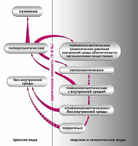 Первичные животные появились при солености выше 5-8 ‰, но ниже современной океанической. Произошедшие от них организмы без внутренней среды (нет полостных жидкостей, крови, лимфы и гемолимфы, как у современных турбеллярий) вышли в пресные воды, а также заняли морские со всем спектром солености. Они дали начало пойкилоосмотическим организмам с выраженной внутренней средой (например иглокожим, морским моллюскам, большинству ракообразных). Некоторые из этих животных, только приобретя гиперосмотическую регуляцию, смогли освоить пресные воды соленостью ниже критической (пресноводные раки, моллюски, рыбы и др.). Гиперосмотические пресноводные, сохранив характерные для них значения внутренней солености, дали начало наземным и вторично морским. Большинство вторично морских при этом стали гипоосмотическими (морские рыбы, креветки-палемониды), остальные - морскими пойкилоосмотическими, которые способны повышать тоничность внутренней среды за счет задержки в крови мочевины. Пунктиром показаны менее вероятные пути эволюции.Румынский академик Э.Пора в свое время предложил рассматривать соленость сред как сочетание двух факторов - осмотического, определяемого общим количеством растворенных частиц, и рапического, обусловленного совместным специфическим действием растворенных ионов. Мы убедились в справедливости этого предположении, изучая физиологическую активность беломорских организмов - личинок-планул медуз Aurelia aurita и взрослых брюхоногих моллюсков Hydrobia ulvae. Животных помещали в сосуды с возрастающей соленостью 2, 4, 6, 8, 10, 12, 14, .., 25‰, куда добавляли многоатомный спирт маннит (он, в отличие, например, от сахаров, метаболически неактивен), доводя во всех случаях среду до общего осмотического давления, соответствующего типичной для Белого моря солености 25‰. Результаты эксперимента показали, что для нормальных реакций всем исследованным организмам обязательно требуется содержание морских солей в среде не менее 5 ‰, и только после этого они могут реагировать на добавленный маннит как на осмотический фактор [6].Таким образом, когда речь идет об осморегуляции, чаще всего имеется в виду поддержание величин внутренней солености. Или, иными словами, осморегуляция осуществляется, прежде всего, механизмами ионорегуляции.