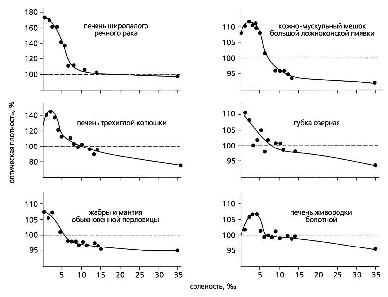 Очевидно, нижний предел внутренней солености тоже располагается очень близко к границе устойчивости белковых комплексов. Об этом можно судить по резкому увеличению оптической плотности тканевых вытяжек разных пресноводных и морских организмов в морской воде соленостью ниже 5-8‰.