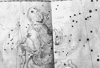 На карте с фигурой Ориона имеется Голубь Ноя, впервые появившийся на глобусе П.Планциуса вместе с 12 новыми созвездиями южной области. Большой Пес у Птолемея просто Пес, а Малый именуется Проционом (“предвестником Пса”).