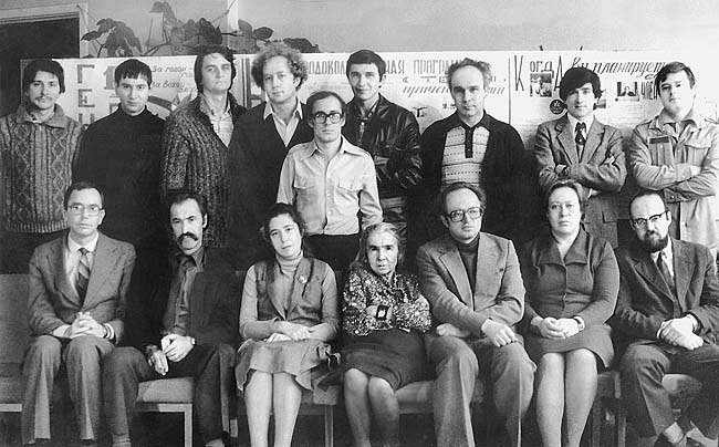 В первом ряду (сидят) сотрудники лаборатории генетики популяций. Слева направо: И.К.Захаров, Э.Х.Гинзбург, Д.П.Фурман, З.С.Никоро, М.Д.Голубовский, И.Д.Ерохина, Р.Н.Чураев. Во втором ряду (стоят) сотрудники группы математической генетики: первый слева Л.Омельянчук, третий слева Ю.Г.Матушкин, далее С.Н.Родин, А.Жарких, В.Соловьев, В.А.Ратнер, крайний справа — Н.А.Колчанов.