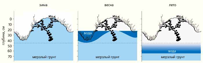 Гнезда Myrmica kamtschatica в разные сезоны. Только к июлю мерзлота отступает (максимум на 60-70 см), а следом понижается уровень надмерзлотных вод, освобождающих, наконец, нижние - зимовочные - камеры. Вся жизнь в теплое время года сосредоточена в верхней части моховой кочки. Пунктирной линией обозначена граница между торфом и минеральным грунтом.Несправедливо не назвать безусловного рекордсмена среди лидеров - L.muscorum. В бассейне Колымы его нет, он найден в соседнем регионе - на северо-востоке Якутии, причем исключительно на участках реликтовых степей. Зимовочные камеры его гнезд, как у L.acervorum, неглубоки - 5-10 см. Но северо-восток Якутии холоднее верховьев Колымы. Здесь, вблизи полюса холода, средние абсолютные минимумы температуры в декабре-январе опускаются до –61…–63°С. Летом крошечные участки реликтовых степей не только самые теплые (максимальная температура на глубине 10 см порядка 27-29°С) среди всех других местообитаний в регионе. Они к тому же самые сухие - влажность почвы около 2-5%. Таким образом, L.muscorum приспособлен и к зимнему холоду, и к летней жаре, и к сухости субстрата. Однако эти феноменальные способности сочетаются с какой-то непонятной пока адаптивной ущербностью: вид отсутствует за пределами степных участков, что-то сдерживает его распространение. Ясно, что не потребность в высокой температуре летом, поскольку в Европе и Америке L.muscorum - несомненный широкий мезофил. Может быть, жизнь в пекле всего лишь “защита” от хищников и от конкуренции со стороны L.acervorum? Да и muscorum ли он? Нужно генетическое подтверждение…