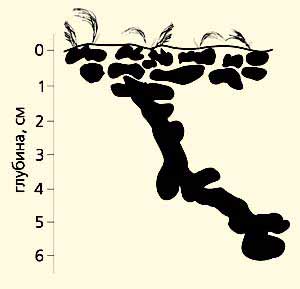 Гнездо Leptothorax acervorum. Поверхностный слой почвы, а с ним и гнезда муравьев подвержены всем превратностям погоды и зимой, и летом. Однако муравьи этого вида, как и L.muscorum, без ущерба переносят охлаждение вплоть до –40°С, а личинки - еще и ниже. Они прекрасно адаптированы и к летним, весьма скудным по теплообеспеченности условиям (кроме как на степных участках), и к зимним холодам. Гнезда L. acervorum имеют примитивнейшее строение; многочисленные (до 10 на 1 м2) зимовочные камеры находятся на глубине всего лишь 5-7 см. Древоточец также прокладывает ходы неглубоко (в 5-15 см от поверхности почвы), причем несмотря на условия, в том числе и уровень зеркала мерзлоты. Гнезда обычно строит в мертвой, сухой древесине; на протяжении 0.5-1.5 м от комля непременно на нижней поверхности корней под корой или в толще древесины может находиться до двух-трех десятков камер, которые и служат зимовочными. Именно такое их расположение - свидетельство безразличия обоих видов к низким температурам. Здесь они опускаются до –25…–28°С, а –20°С держится в гнездах около двух месяцев. Полярный муравей устраивает зимовочные камеры чуть глубже - в 10-15 см, редко 25 см от поверхности почвы, где, разумеется, помягче: минимумы порядка –18…–22°С, но –15°С регистрируется в течение месяца.