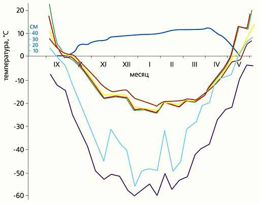 Снега мало, поэтому и под ним холодно. Среднегодовая температура воздуха на всем востоке страны на юг до бассейна Амура отрицательна, значит - повсеместна мерзлота, прорезанная узкими полосами таликов вдоль рек. Температура мерзлоты, измеряемая на глубине, где не сказываются сезонные колебания (3-4 м), невелика, обычно всего-то –4…–6°С. Правда, никто там и не живет. В тощей же почве, мощность ее редко превышает 15-20 см, температуры на глубине 10 см в ноябре при бесснежье падают до –20…–30°С. По мере роста снежного покрова в почве теплеет, но ненамного, ибо 30-50 см снега принципиально не меняют дела. Самое теплое место из найденных нами - в горных тундрах (выше 1200 м над ур.м.) под двухметровыми надувами снега. Тут зарегистрированы аж –9°С; только под надувами тоже мало кто живет (разве что полевки, весной выселяющиеся из-под тающих снежников в летние норы) - и без того короткий теплый сезон здесь непозволительно урезан.