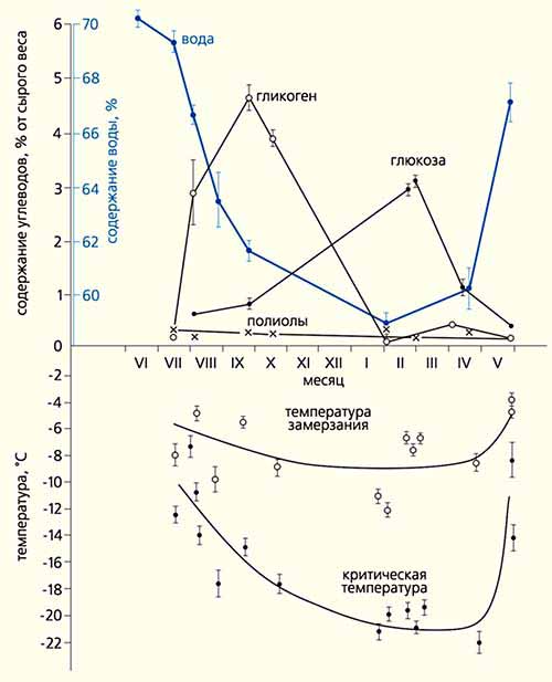 Содержание углеводов и воды (вверху) у рабочих особей F.exsecta существенно меняется от лета к зиме, обеспечивая лишь невысокую холодоустойчивость этого вида. На температурном поле кружочками со штрихами обозначены средние значения и дисперсия показателя в разных гнездах.Таким образом, биохимические основы защиты от холода в основных чертах задаются родовым уровнем. Однако принадлежность к роду и даже подроду, по-видимому, определяет адаптивную стратегию холодоустойчивости конкретного вида далеко не полностью. Три вида - F.lemani, F.picea и F.gagatoides, относящиеся к одному подроду (Serviformica) и обитающие здесь в нехарактерных в целом для рода условиях [6], - имеют, между тем, крайне различную холодоустойчивость. У F.lemani, F.picea она весьма “средняя” (по отношению ко всему диапазону холодоустойчивости изученных видов); у F.gagatoides достигает столь значительных величин, что оказывается близкой к таковой у представителей рода Myrmica, обладающих иной биохимической обеспеченностью.В целом же наши муравьи используют три адаптивных стратегии к низким температурам зимовки. У С.herculeanus, L.acervorum и L.muscorum все построено на физиолого-биохимических возможностях - очень высокая устойчивость к холоду обеспечивается накоплением антифризов, что позволяет им зимовать непосредственно у поверхности почвы. В основе адаптивного пути второй группы (F.gagatoides, M.kamtschatica и M.bicolor) - компенсация недостаточности физиолого-биохимических возможностей поведенческими адаптациями. Эти муравьи могут жить где угодно, устраивая зимовочные камеры поглубже. Третья группа, включающая наиболее чувствительные к холоду виды из рода Formica, существует лишь в особых, благоприятных для них условиях, складывающихся в небольшой группе местообитаний; ее физиолого-биохимические возможности невелики. Таким образом, хотя физиолого-биохимическая основа задается на уровне рода, адаптивная стратегия видов сугубо индивидуальна и осуществляется различными сочетаниями физиолого-биохимических и поведенческих механизмов *. В ряде случаев интегральные адаптивные возможности представителей разных родов могут быть практически одинаковы.