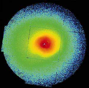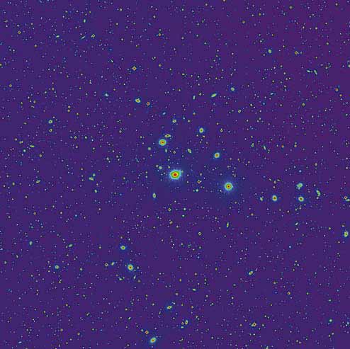 Рис. 2. Изображение скопления галактик в созвездии Персея в рентгеновском диапазоне [1]. Цвет отражает яркость рентгеновского излучения - от голубого (маленькая яркость) на периферии скопления к красному (большая яркость) в центре скопления. Потенциальная яма, создаваемая темной материей, заполнена горячим газом. Этот газ и порождает рентгеновское излучение.