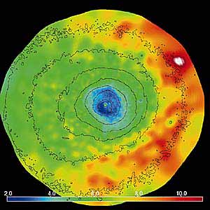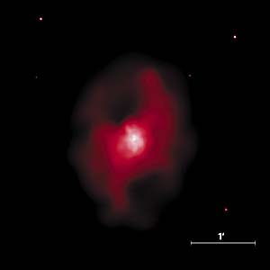Рис. 7. Рентгеновское изображение скопления MS 0735.6+7421 [5]. По обе стороны от ядра заметны темные пятна. Как и в случае скопления галактик в созвездии Персея, радиоизлучение (не показано на рисунке) “заполняет” эти пятна. Интересно, что на рентгеновском изображении скопления в Персее (рис.6) видны еще несколько темных пятен, в частности, пятно серповидной формы выше и правее центра, причем радиоизлучение из этой области тоже весьма мало. Оказывается, что и такие пятна можно связать с пузырями релятивистской плазмы - просто эти пузыри много старше, и самые энергичные электроны, генерирующие радиоизлучение, давно потеряли свою энергию, и радиоизлучение исчезло. Но электроны меньших энергий и протоны по-прежнему наполняют пузырь, не давая окружающему газу занять этот объем.