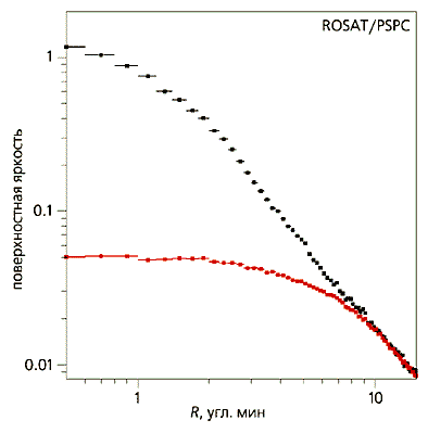 Рис. 5. Сравнение профилей поверхностной яркости в скоплении с потоком охлаждения (синие точки) и без потока охлаждения (красные точки). Расстояние (в проекции на изображение) отсчитывается от центра скопления. Поверхностная яркость в рентгеновском диапазоне связана с плотностью газа, а в потоках охлаждения плотность газа сильно возрастает к центру скопления. Примеры, показанные на рисунках, дают убедительный аргумент в пользу концепции потоков охлаждения. На протяжении почти 30 лет считалось, что эта концепция в основном правильная и только некоторые детали подлежат уточнению. Однако среди “деталей” были и очень серьезные проблемы. В частности, совершенно непонятен был вопрос: до каких температур остывает газ и куда он потом девается? Как мы уже знаем, темп остывания зависит от плотности газа. По мере остывания и падения температуры его плотность увеличивается, чтобы давление остывающего газа приблизительно соответствовало давлению окружающих слоев. Поэтому растет и скорость остывания. И горячий газ, начавший остывать при температуре в десятки миллионов градусов, сначала остывает медленно, а затем все быстрее и быстрее, пока его температура не упадет ниже десяти тысяч градусов. При более низких температурах водород становится нейтральным, и процесс охлаждения качественно меняется и замедляется. Следовательно, можно ожидать, что остывший газ имеет температуру, не превышающую 104 К. С другой стороны, сравнение светимости центральных областей скоплений (~1044-1045 эрг/с) с тепловой энергией одной частицы 3/2kT, где Т - температура газа, k - постоянная Больцмана, позволяет оценить: чтобы обеспечить наблюдаемую светимость, каждый год должна охлаждаться масса газа порядка 100-1000 солнечных масс (так называемый темп охлаждения). Тогда за характерное время жизни скопления порядка 1010 лет масса охладившегося газа должна составить примерно 1012-1013 M¤! Многочисленные попытки обнаружить столь огромное количество газа не привели к успеху. В частности, было показано, что этот газ не может переработаться в звезды. В противном случае в центральных областях скоплений следовало бы ожидать темпа звездообразования, сравнимого с темпом охлаждения, т.е. порядка 100-1000 солнечных масс в год. Все скопления, где наблюдаются потоки охлаждения, действительно содержат в своем центре гигантскую эллиптическую галактику (см. пример на рис.1) с массой звезд порядка 1012 M¤, но при темпе звездообразования даже в 100 солнечных масс в год эти галактики должны быть значительно более яркими в голубом свете, чем наблюдается. Реальный предел для темпа звездообразования в них более чем на порядок ниже предсказаний модели потоков охлаждения. Целый ряд моделей, часто весьма элегантных, был разработан для объяснения возникших проблем, и было очевидно, что нужны новые наблюдения, чтобы окончательно утвердить или опровергнуть простую модель потоков охлаждения. Такие данные появились с запуском европейской орбитальной рентгеновской обсерватории “XMM-Newton”. Специальная дифракционная решетка для рентгеновского диапазона длин волн позволяет регистрировать рентгеновские эмиссионные линии различных тяжелых элементов (кислорода, железа, кремния), которые характерны для плазмы, имеющей температуру в диапазоне 105-108 К. Уже первые наблюдения потоков охлаждения в самых ярких скоплен