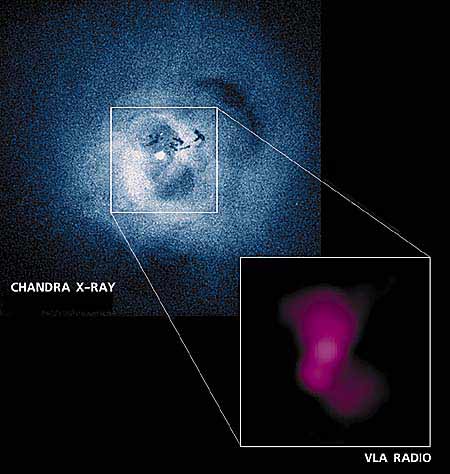 Рис. 6. Рентгеновское изображение самой центральной области скопления [4] галактик в созвездии Персея, полученное спутником “Chandra”. Видны темные пятна сверху и снизу от ядра. На врезке справа показана карта радиоизлучения этой области. Видно, что радиоизлучение идет именно из тех областей, где понижена яркость в рентгеновском диапазоне.На самом деле излучение - далеко не единственный механизм, с помощью которого черная дыра способна нагревать газ. Решающим фактором в выяснении этого вопроса стало сравнение наблюдений скоплений в радио- и рентгеновском диапазонах длин волн. На рис.6 показано изображение в рентгеновском диапазоне центральной области ярчайшего скопления галактик в созвездии Персея, полученное обсерваторией “Chandra”. Яркая точка в середине изображения - это сверхмассивная черная дыра в центре гигантской галактики NGC1275, а все остальное свечение связано с горячим газом. Видно, что газ распределен очень неравномерно - вместо плавного повышения рентгеновской яркости к центру скопления на картинке видны асимметричные яркие и темные пятна. Особенно четко выделяются два темных пятна, окруженные более яркими кольцами, - сверху и снизу от сверхмассивной черной дыры. С правой стороны на рис.6 представлено изображение той же области, но в радиодиапазоне. Ядро галактики NGC1275 - очень мощный источник радиоизлучения, вокруг которого есть более слабое и протяженное гало. Именно это гало изображено на рис.6, а излучение самого ядра на рисунке специально подавлено. Как и во многих других галактиках, наблюдаемое радиоизлучение связано с синхротронным излучением высокоэнергичных электронов. Эти электроны делают “видимыми” потоки релятивистской плазмы, формирующиеся вблизи черной дыры и далее распространяющиеся на большие расстояния от нее. Иногда такие потоки имеют форму очень узких струй на расстояниях в сотни килопарсек, а в других случаях релятивистская плазма образует весьма аморфную структуру, подобную представленной на рис.6. Сравнение радио- и рентгеновского изображений показывает, что радиоизлучение идет из тех самых мест, которые на рентгеновском изображении выглядят темными пятнами. Учитывая, что наблюдаемое рентгеновское излучение связано с горячим (но не релятивистским) газом, можно сделать вывод, что такого газа меньше в тех областях, где присутствует релятивистская плазма. Тщательный анализ изображений подтверждает данный вывод - можно сказать, что релятивистская плазма попросту расталкивает окружающий газ, надувая в нем огромные пузыри. Скопление в созвездии Персея не уникально - пузыри наблюдаются и во многих других скоплениях (см., например, рис.7: ситуация в указанном скоплении полностью аналогична предыдущей, и известен еще десяток [6] таких примеров).