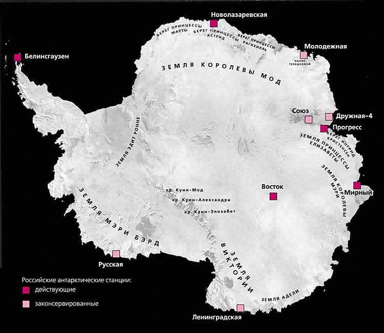 а также показаны местонахождения российских антарктических станций.На карте Антарктики запечатлены почти все имена королевского дома Великобритании. В честь королей названы: п-ов Эдуарда VII на побережье моря Росса, Берег Георга V на побережье Земли Виктории, залив Эдуарда VIII в море Содружества, шельфовый ледник Георга VI, отделяющий Антарктический п-ов от открытой Первой русской антарктической экспедицией Земли Александра I в Западной Антарктиде.