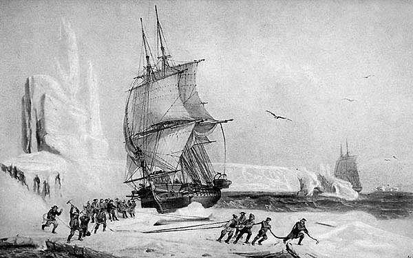 На судах "Эребус" и "Террор" (слева) английская экспедиция под командой Дж.К.Росса в 1841 г. подошла к берегам гористой страны.