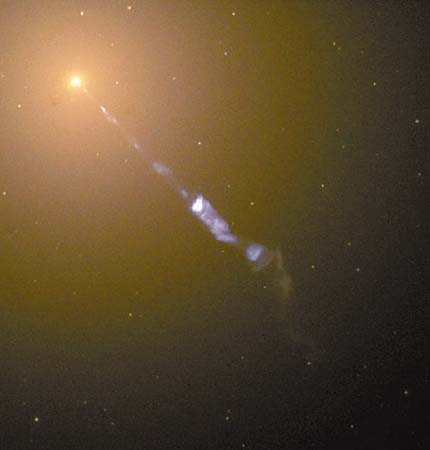 Наша Галактика находится на окраине типичного скопления галактик, в центре которого располагается большая эллиптическая галактика M87. Еще в начале прошлого века астроном Х.Куртис разглядел на правильном эллиптическом профиле M87 "странный прямой луч". Позднее выяснилось, что луч представляет собой струю, или джет, бьющую из центра галактики. Великолепное оптическое изображение этого джета было получено космическим телескопом "Хаббл" (рис.1). Наилучшим образом джет виден в радиодиапазоне, где не мешает излучение звезд. Джет просматривается начиная с расстояния порядка парсека от центра M87, сравнимого с дистанцией между звездами, вплоть до нескольких десятков килопарсеков, что даже больше диаметра галактики. Радиоизображения свидетельствуют о наличии двух джетов, вытекающих в противоположные стороны. Джеты снабжают высокоэнергичными частицами широко разнесенные протяженные области радиоизлучения. Линейный размер последних превышает диаметр звездной составляющей галактики, видимой в оптическом диапазоне. Именно эти области дают основной вклад в общее мощное радиоизлучение M87, благодаря которому ее относят к радиогалактикам.