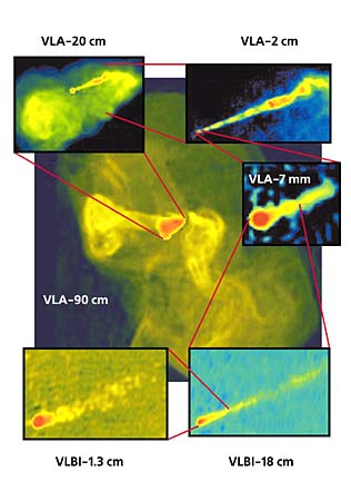 джеты, аккреционный диск и центральная черная дыра.В радиодиапазоне, где наблюдается большинство джетов, преобладает синхротронное излучение электронов и, возможно, позитронов, если последние также присутствуют в джете. Синхротронное излучение - это электромагнитное излучение релятивистских заряженных частиц, которое обусловлено их вращением в магнитном поле и имеет характерные частоты, пропорциональные квадрату энергии частиц. Поскольку в джете есть электроны с самой разной энергией, его синхротронное излучение распределено в очень широком интервале частот, допускающем наблюдения самыми различными приборами.