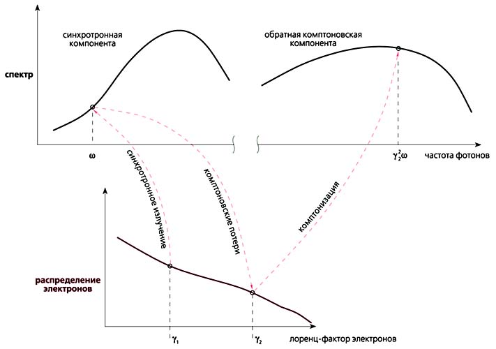 Среди многочисленных механизмов излучения высокоэнергичных электронов и позитронов в релятивистских джетах, как уже говорилось, основную роль играют синхротронное излучение и обратное комптоновское излучение, которое происходит за счет рассеяния низкоэнергичных фотонов высокоэнергичными частицами. Источником таких фотонов для комптоновского механизма может служить как излучение аккреционного диска, так и собственное синхротронное излучение ускоренных частиц джета.