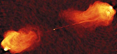 Изображение получено на телескопах Национальной радиоастрономической обсерватории в США (NRAO/AUI/NSF).Совершенно иной пример релятивистских джетов дают источники гамма-всплесков [7]. В этом случае джеты никогда не наблюдались, а их существование следует из косвенных, хотя и весьма убедительных, аргументов. Природа данных источников достоверно не известна. Однако доказано, что они расположены на расстояниях, сравнимых с размерами видимой части Вселенной, и что за время типичного всплеска (несколько десятков секунд) должна выделяться энергия, сравнимая с энергией покоя Солнца (и это только в виде гамма-излучения!). Наиболее популярная модель связывает образование гамма-всплесков с быстрой аккрецией звездного вещества на черную дыру, возникающей при катастрофическом сжатии (коллапсе) ядра сверхновой. Их колоссальная наблюдаемая светимость (порядка 1050-1052 эрг/c), на первый взгляд, не согласуется с малыми размерами источника: плотность фотонов в нем настолько высока, что они, взаимодействуя друг с другом, должны породить непрозрачное облако электрон-позитронных пар. Эту трудность можно преодолеть, если предположить, что к наблюдателю с релятивистской скоростью движется узкий излучающий джет. Тогда резко снижаются требования к величине светимости источников гамма-всплесков, удается объяснить многие свойства наблюдаемого излучения от гамма- до радиодиапазона, а также понять происхождение высокоэнергичных частиц, создающих это излучение (об этом чуть дальше).