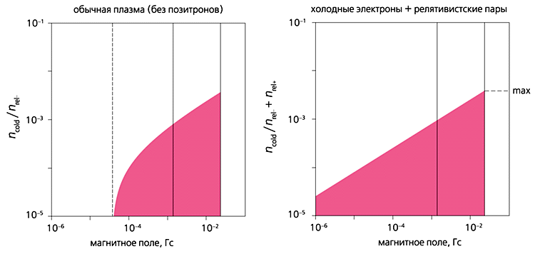 Рис. 5. Диаграммы на плоскости параметров "магнитное поле-содержание холодных электронов ncold по отношению к релятивистским частицам" для квазара 3С279: слева - для обычной плазмы из электронов (nrel-) и протонов (но без позитронов), справа - для плазмы из релятивистских электрон-позитронных пар (nrel- + nrel+) и фракции холодных электронов. Цветом выделены области параметров, соответствующих данным радионаблюдений. Вертикальная сплошная линия обозначает величину магнитного поля, полученную по наблюдаемой частоте максимума интенсивности синхротронного излучения. Штриховая линия определяет минимальное магнитное поле, при котором обычный состав джета удовлетворяет экспериментальным данным.В случае электрон-протонного состава плазмы (без позитронов) при фиксированных яркостной температуре и угле поворота плоскости поляризации возможные значения магнитного поля ограничены снизу. Удовлетворить наблюдениям при более слабых магнитных полях можно, только заменив часть релятивистских электронов на позитроны. О величине магнитного поля можно судить по наблюдаемой частоте максимума интенсивности синхротронного излучения джета.Для примера укажем, что относительное содержание холодных электронов в джетах двух внегалактических источников - квазара 3C279 и объекта BL Ящерицы - очень низкое, порядка одного процента и меньше, т.е. плазма является релятивистской. Вместе с тем данные радионаблюдений квазара 3C279 допускают наличие в его джете как обычной электрон-протонной, так и электрон-позитронной плазмы. В джетах объекта другого класса - микроквазара GRS1915+105 в нашей Галактике - концентрация холодных электронов может существенно превышать концентрацию релятивистских частиц.
