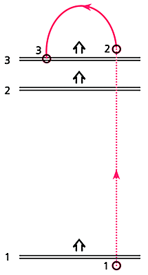 Рис. 6. В конверсионном механизме ускорения частица покидает ударную волну, будучи нейтральной (момент времени 1), и движется прямолинейно до своего превращения в заряженную (момент 2). За это время частица обгоняет фронт ударной волны на некоторое расстояние, так что у нее появляется достаточный запас времени, чтобы развернуться в магнитном поле прежде, чем она будет вновь подхвачена ударной волной (момент 3). Положения частицы и фронта ударной волны в соответствующие моменты времени отмечены цифрами 1, 2 и 3.Разумеется, выключение и включение электрического заряда - это лишь условный способ описания происходящих процессов. Так, при рассеянии фотона на релятивистском электроне этот (незаряженный!) фотон с известной вероятностью будет двигаться в том же направлении, что и исходный электрон, и нести почти всю его энергию. Такой фотон, столкнувшись с относительно низкочастотным фотоном из поля излучения джета, породит заряженные высокоэнергичные электрон и позитрон, причем энергия поделится между ними примерно поровну. То обстоятельство, что в результате указанного электрон-фотонного цикла "выключения" и "включения" заряда количество ускоряемых частиц удваивается, не играет принципиальной роли.Аналогичная цепочка превращений существует и для протонов. Фотоны, энергия которых превышает 350 МэВ в системе покоя протона, могут возбуждать его внутренние (кварковые) степени свободы. Возбужденный адрон моментально распадается на нуклон и пион. Приблизительно в трети случаев образуется заряженный пион, а протон превращается в нейтрон. Обладая аналогичной кварковой структурой, нейтроны взаимодействуют с фотонами по той же схеме, т.е. переходят в протоны. Побочным продуктом протон-нейтронного цикла становятся высокоэнергичные заряженные пионы, распад которых приводит к появлению вторичных электронов и позитронов, а также нейтринного излучения.