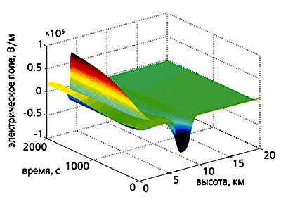 Оптическая вспышка в мезосфере возникает через несколько миллисекунд после положительного разряда облако-земля, иногда на удалении несколько десятков километров по горизонтали от канала молнии. Разряд зажигается на достаточно большой высоте, поскольку порог пробоя воздуха падает с высотой экспоненциально, тогда как амплитуда возмущений электрического поля, возникающих в момент мощных молниевых вспышек облако-земля, уменьшается с высотой гораздо медленнее - по степенному закону, и на высотах примерно 75 км в атмосфере превышает пробойное поле (рис.6).