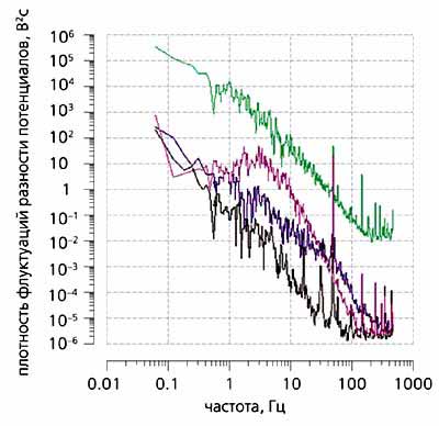 Рис. 4. Спектры электрогазодинамической турбулентности (лабораторное моделирование).Видно, что под влиянием капель воды (фиолетовая кривая), внешнего поля (бордовая кривая) и обоих этих факторов (зеленая кривая) возмущения потенциала в потоке слабоионизованного воздуха (черная кривая - в отсутствие этих факторов) существенно возрастают. Подъем спектра на частотах несколько Гц определяется величиной внешнего поля и масштабом занятой им области.Как стартует молнияПроблема инициации молниевого разряда остается одной из наиболее острых и объединяет целый комплекс вопросов. Кратко остановимся на двух из них.
