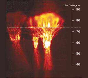 Мощный импульс изучению грозового электричества в самом конце XX века дали наблюдения разрядных явлений в средней атмосфере, коррелирующих с грозовой активностью, - спрайтов (область свечения простирается от высот 50-55 км до 85-90 км над землей, а длительность вспышки составляет от единиц до десятков миллисекунд), эльфов (высоты - 70-90 км, продолжительность менее 100 мкс) и джетов (разряды, стартующие в верхней части облака и распространяющиеся порою до мезосферных высот со скоростью около 100 км/с). Регистрация высотных разрядов и диагностика их характеристик осложнены из-за малого времени жизни и спорадической природы грозовых разрядов. Отчасти поэтому до сих пор физические модели спрайтов, эльфов и джетов остаются предметом дискуссий. Пожалуй, наибольшая информация к настоящему времени накоплена о спрайтах (рис.5).