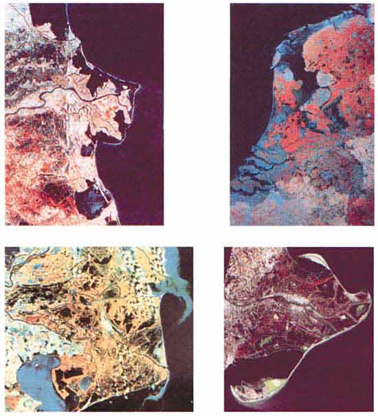Космические снимки дельт рек Европы: вверху - По (слева) и Рейна, внизу - Дуная (слева) и Эбро.
