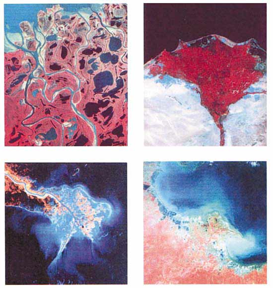 Космические снимки дельт: вверху - р.Колвилл на Аляске (слева) и Нила, внизу - Миссисипи (слева) и Хуанхэ.
