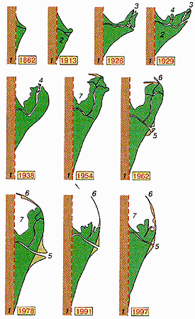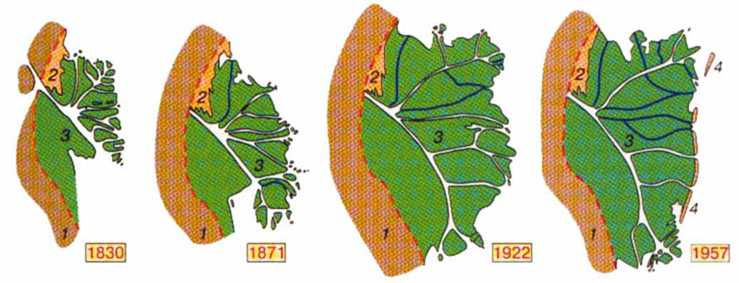 На протяжении последних 2000-2500 лет (пожалуй, кроме XX в.) дельты, как правило, активно выдвигались в море, о чем свидетельствуют многочисленные исторические, археологические и картографические материалы. Так, в дельте Дона на большом расстоянии от морского берега обнаружены развалины древнегреческого поселения Танаис и генуэзского - Тана (на месте нынешнего г.Азова), когда-то находившихся на самом берегу. В устье Риони в 134 г. римским императором Адрианом была построена крепость Фасис. В XIX в. ее остатки оказались уже на расстоянии 5 км от выдвинувшегося морского берега. Село Липованское (ныне г.Вилково) возникло вблизи берега Черного моря, в устье Дуная, в середине XVIII в. К началу XX в. берег дельты выдвинулся в море на 18-20 км. В устье р.По 2500 лет назад этрусками был основан г.Спина. Следы этого города были недавно обнаружены археологами в 10 км от моря. Остатки гаваней, сооруженных на морском берегу дельты Тибра римскими императорами Клавдием и Траяном в I в., находятся сейчас внутри дельты, на расстоянии 5 км от современного берега.