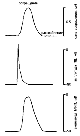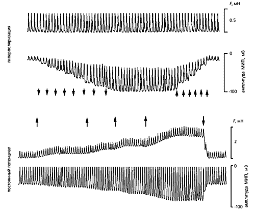 Фибробласты специфически, иначе, чем кардиомиоциты, реагируют и на искусственную поляризацию мембраны, и на растяжение ткани сердца. Так, вызванная гиперполяризация внутренней мембраны фибробластов спонтанно сокращающегося сердечного фрагмента обычно приводит к увеличению амплитуды МИП, а деполяризация - к уменьшению. Примечательно, что первый сдвиг зависит от величины, на которую сместился потенциал покоя фибробластов, а второй - от степени искусственной поляризации.