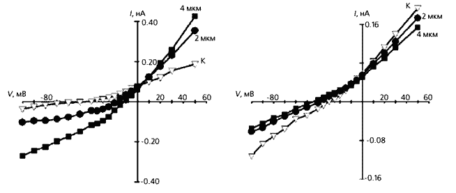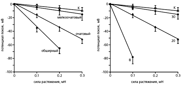 Реакция изолированного фибробласта на сдавливание (слева) и растяжение. Видно, что в первом случае электрическая проводимость увеличивается по сравнению с нормальной клеткой (К), и чем больше она сжата, тем сильнее ток, но потенциал покоя при этом уменьшается. Ответ фибробласта на растяжение противоположен - его мембранная проводимость снижается, а потенциал покоя увеличивается.Мы объясняем повышенную чувствительность фенотипически измененных инфарктом фибробластов (т.е.миофибробластов) к механическому воздействию увеличением числа МСК в мембране (их участие подтверждается действием ингибитора каналов - ионами гадолиния). Даже небольшое растяжение способно активировать дополнительное количество МСК и тем повысить входящий ток. А поскольку возрастает и концентрация свободного внутриклеточного кальция, открываются зависимые от этого иона калиевые каналы и мембранный потенциал сильно сдвигается в сторону гиперполяризации.