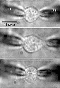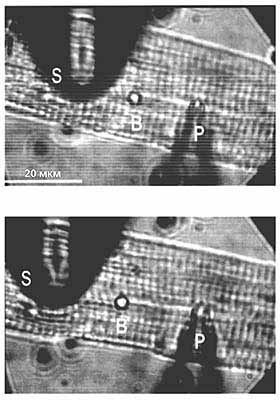 Микрофотографии изолированного кардиомиоцита. Вверху: клетка, к мембране которой подведены две микропипетки - регистрирующая (Р) и растягивающая (S), - но ни одна еще не задействована; внизу - растянутый кардиомиоцит. Для визуального слежения за растягиванием между пипетками помещен резиновый шарик (B). Через первую пипетку, которая содержит электролит, подается отрицательное давление такой силы, чтобы прорвать мембрану и установить контакт между содержимым клетки и электролитом, после чего и регистрируется ионный ток. Второй пипеткой клетка только растягивается. По результатам измерения силы тока до и после механического воздействия можно судить о влиянии последнего на генерацию ионного тока клетками сердечной мышцы.
