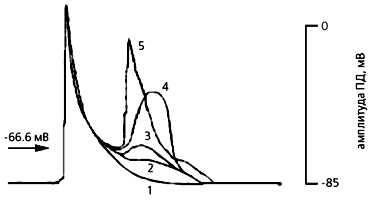 Зависимость величины мембранного потенциала от степени растяжения препарата предсердной ткани крысы, перенесшей инфаркт миокарда. Кривая 1 соответствует потенциалу при физиологическом растяжении, на каждом следующем шаге (кривые 2-5) сила увеличена на 0.05 мН. Когда растяжение приводит к критическому уровню деполяризации (равному –66.6 мВ), возникает внеочередной потенциал.