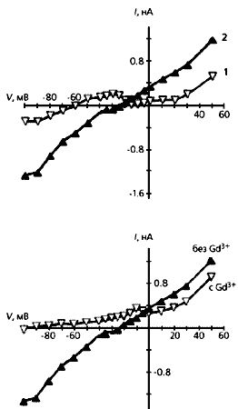 Изменение силы неселективного катионного тока и потенциала его реверсии в кардиомиоците из левого желудочка человеческого сердца после инфаркта миокарда. Вверху - общий ток до механического воздействия на клетку (1) и после ее растяжения на 4 мкм (2). Видно, что в растянутой клетке меняется как сила тока, так и потенциал, при котором выходящий из клетки ток меняется на входящий: уменьшается по абсолютной величине с –60 мВ примерно до –20 мВ. Внизу - ток, протекающий через растянутый кардиомиоцит с добавлением ионов гадолиния (Gd) и без них. Здесь проявляется роль этих ионов как ингибиторов механочувствительных каналов.Таким образом, прямое растяжение как предсердных, так и желудочковых кардиомиоцитов вызывает деполяризацию их мембраны и увеличение фазы реполяризации на уровне 90%. Если оба эти процесса достигают критических величин, возникает дополнительный потенциал действия, что приводит к экстрасистоле - внеочередному сокращению сердечных камер.