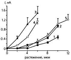 Зависимость силы тока от величины растяжения желудочковых кардиомиоцитов из сердца крысы (1-3), больного человека (4) и трехмесячной морской свинки (5). Как видно из графика, меньше всего реагирует на такое механическое воздействие клетка молодой крысы (1), несколько сильнее - старой (2), и наиболее силен электрический ответ кардиомиоцита у крысы того же возраста, но больной гипертензией (3); реакция же клетки из больного сердца человека немногим ниже, чем у такой крысы, а клетка миокарда молодой морской свинки отвечает на растяжение током почти той силы, что кардиомиоцит старой крысы.Итак, полученные нами результаты позволяют заключить, что не только электрическое возбуждение приводит к сокращению или расслаблению клеток сердца, т.е. к их механическому изменению, но и наоборот - на механическое воздействие кардиомиоциты отвечают электрической активностью. Однако если прямая связь обеспечивает нормальный сердечный ритм, то обратная сказывается противоположным образом - нарушением ритмики при всех патологиях.